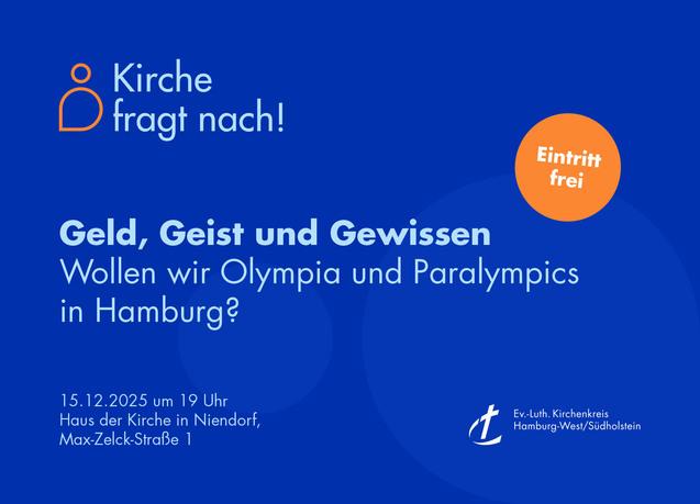 Der ev.-luth. Kirchenkreis Hamburg West/Südholstein lädt am 15. Dezember um 19 Uhr alle Interessierten zu einer Podiumsdiskussion im Haus der Kirche in Niendorf, Max-Zelck-Straße 1 zum Thema: „Geld, Geist und Gewissen: Brauchen wir Olympia in Hamburg?“