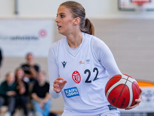 Für zwei Spielerinnen wird die Partie zu einem Familientreffen: Die Zwillingsschwestern Lotta und Luise Linke beschritten ihren (erfolgreichen) basketballerischen Lebensweg bislang gemeinsam, wurden unter anderem im August Seite an Seite Deutsche U18-Meisterinnen im 3x3. Nun stehen sie sich kurz nach ihrem 18. Geburtstag als Kontrahentinnen unter den Körben gegenüber. Denn die nach einer Fußverletzung wiedergenesene Lotta (Foto) wechselte vor der Saison an die Hohe Weide, spielt aber parallel weiter mit Doppellizenz für Wedel in der Regionalliga. Luise hingegen blieb in Rotenburg, suchte sich mit den Hamburg Towers – ebenfalls Regionalligist – ein anderes “Zweitteam” aus. So gibt es das Familientreffen in dieser Saison inklusive Pokal gleich fünfmal.