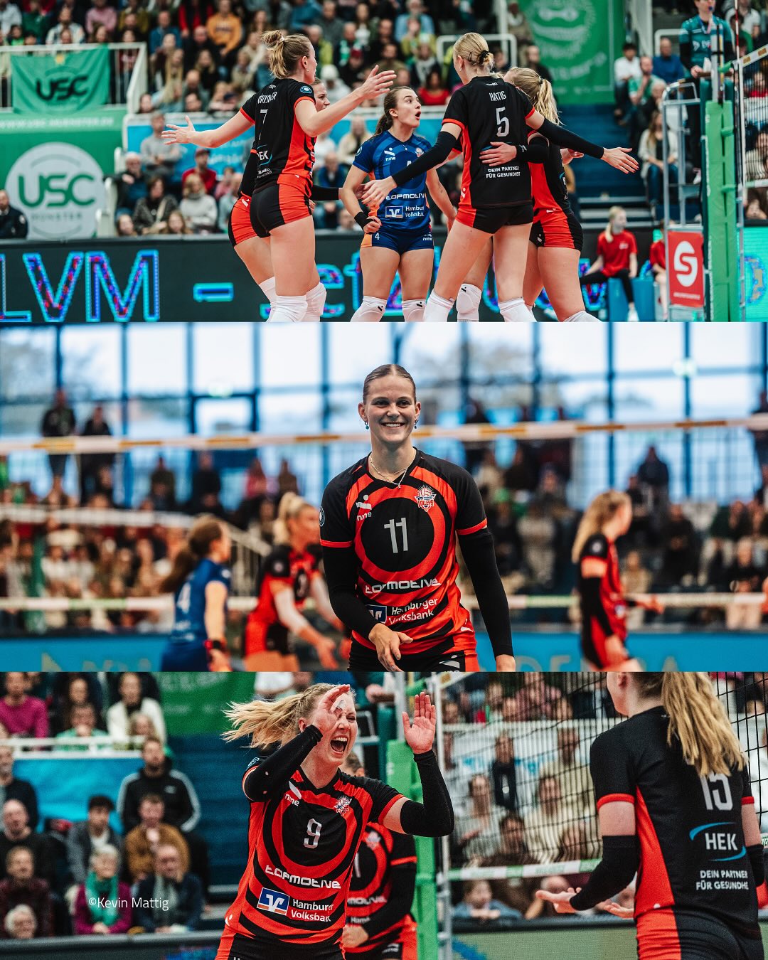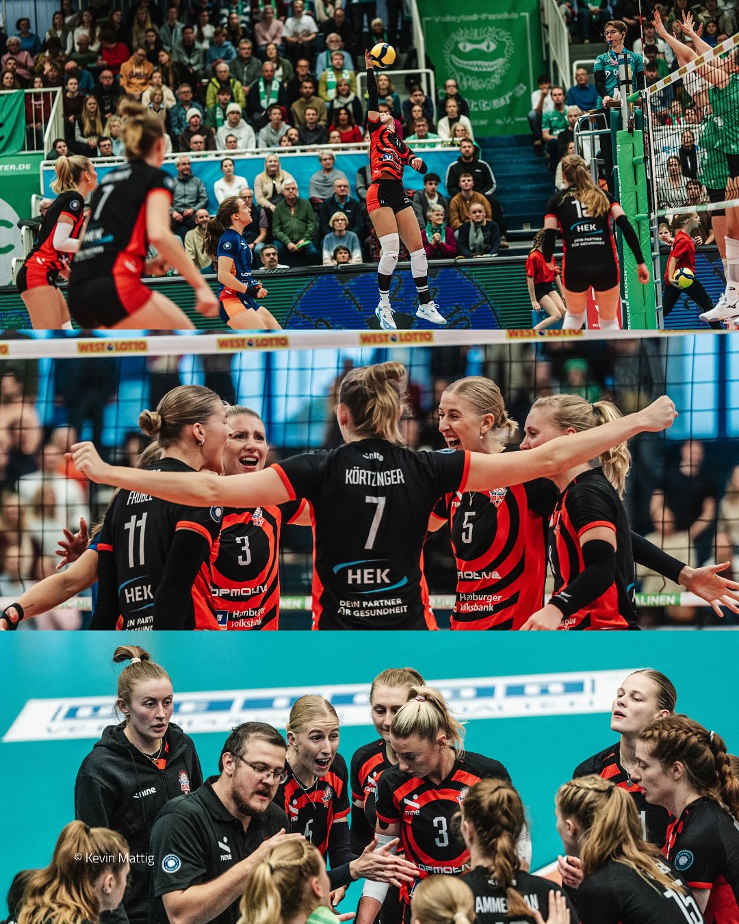 Dann der Moment, auf den Hamburg gewartet hatte: Im dritten Satz kämpfte sich das Team Punkt für Punkt in die Partie zurück. Starke Aufschläge, mutige Blockaktionen und unerschütterlicher Teamgeist sorgten für den verdienten Satzgewinn – 25:22! Als der letzte Ball zu Boden fiel, kannte die Stimmung in der Halle keine Grenzen mehr. Der erste Satzgewinn in der Bundesliga-Geschichte des Vereins wurde frenetisch gefeiert.