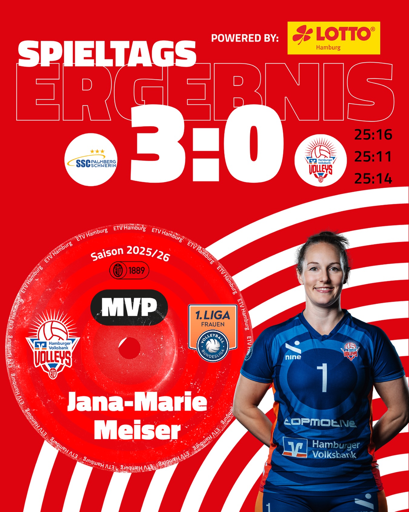 Die ETV Hamburger Volksbank Volleys verloren am Sonnabend, den 29. November 2025 gegen die Tabellennachbarinnen Schwarz-Weiß Erfurt mit 3:1 / 96:70 (21:25 / 25:13 / 25:18 / 25:14), konnten aber im ersten Satz überzeugen und zunächst mit 1:0 in Führung gehen.