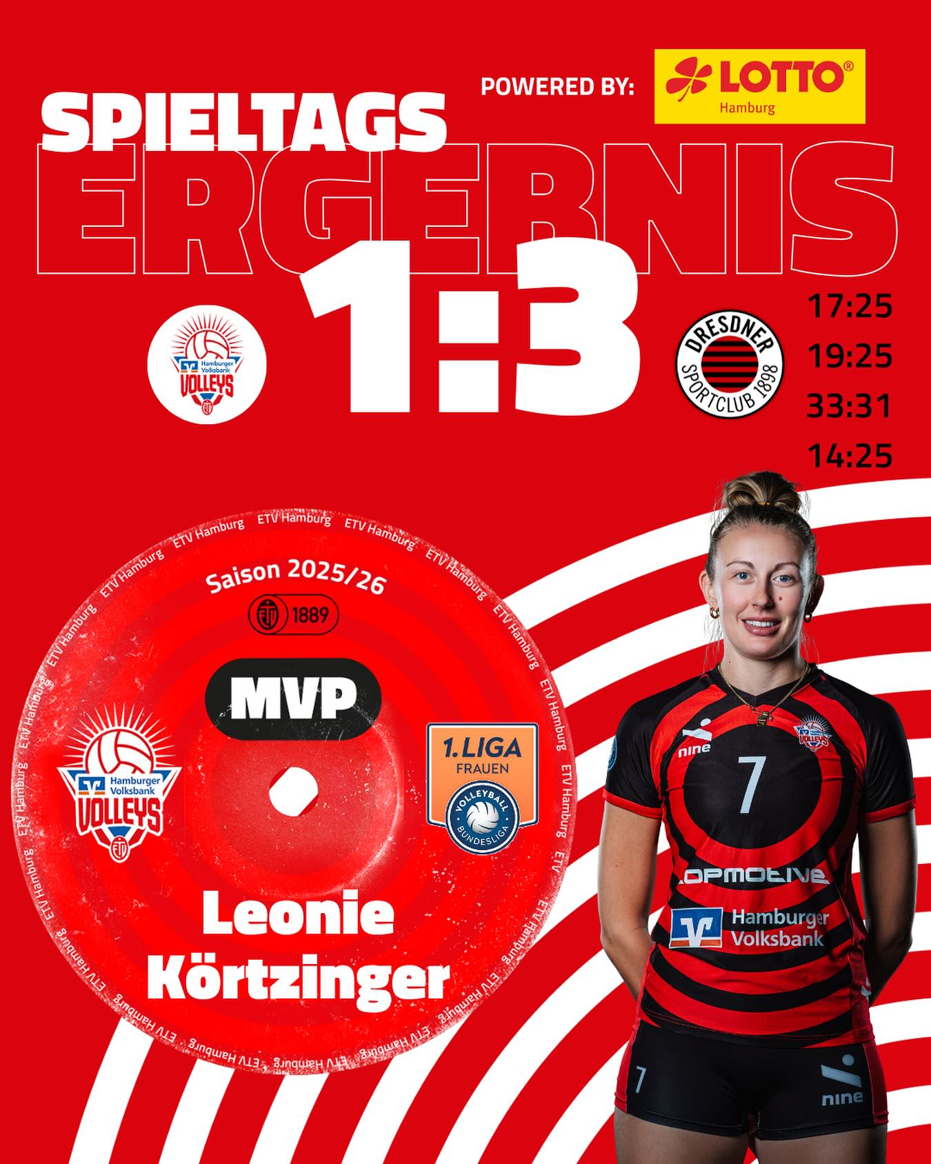 Die ETV Hamburger Volksbank Volleys verloren am Sonnabend, den 29. November 2025 gegen die Tabellennachbarinnen Schwarz-Weiß Erfurt mit 3:1 / 96:70 (21:25 / 25:13 / 25:18 / 25:14), konnten aber im ersten Satz überzeugen und zunächst mit 1:0 in Führung gehen.