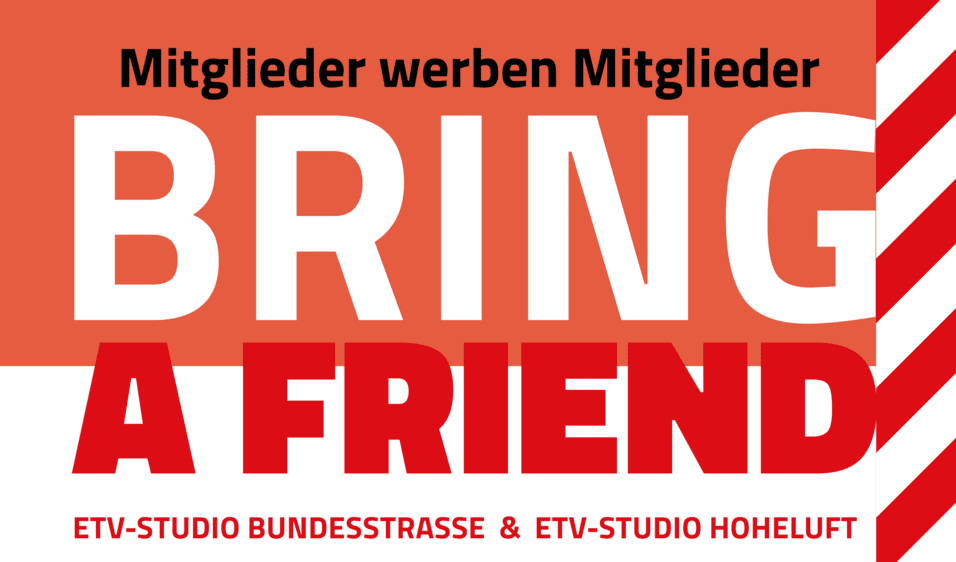 Die ETV-Studios Bundesstraße und Hoheluft starten im April wieder ihre beliebte Mitglieder-werben-Mitglieder-Aktion „Bring a Friend“, die perfekte Gelegenheit also, Freund:innen, Bekannte oder Kolleg:innen für die Studios des ETV zu begeistern, dabei ordentlich zu sparen und mit etwas Glück tolle Prämien zu gewinnen.