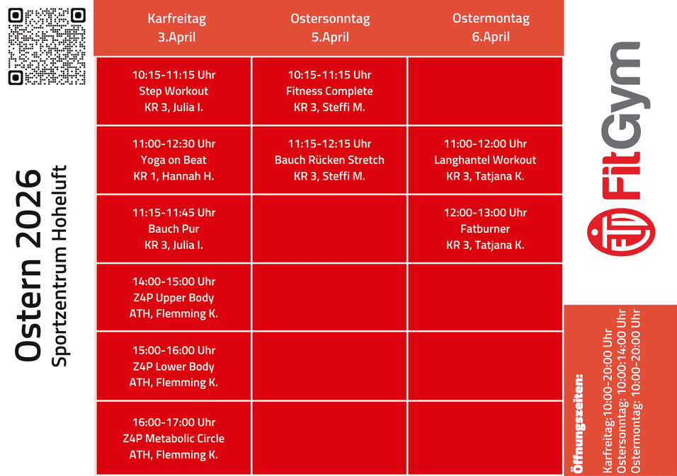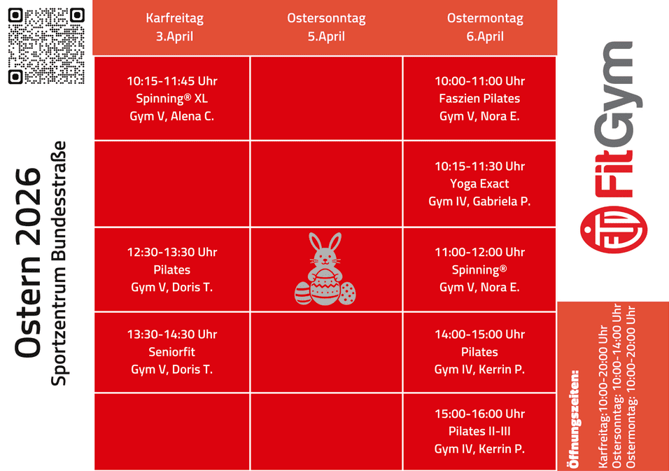 An Karfreitag (3. April), Ostersonntag (5. April) und Ostermontag (6. April) findet das reguläre Kursprogramm nicht statt. Stattdessen erwartet euch in beiden ETV-Sportzentren ein vielseitiges Feiertagsprogramm.