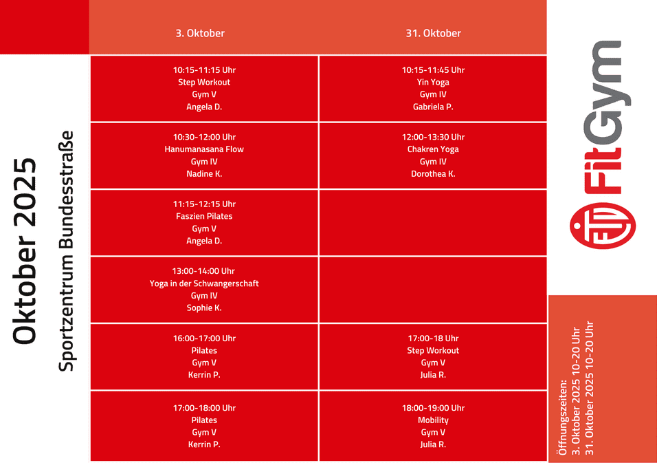 An den Feiertagen am 3. und 31. Oktober 2025 findet das reguläre Kursprogramm nicht statt. Die Buchung erfolgt 48 Stunden vor Kursbeginn über die ETV-App.