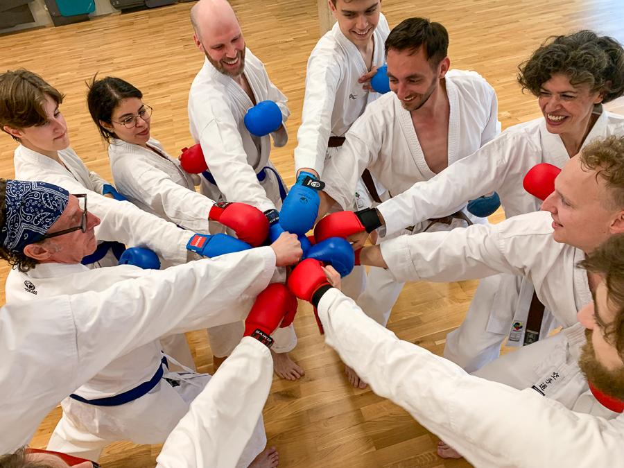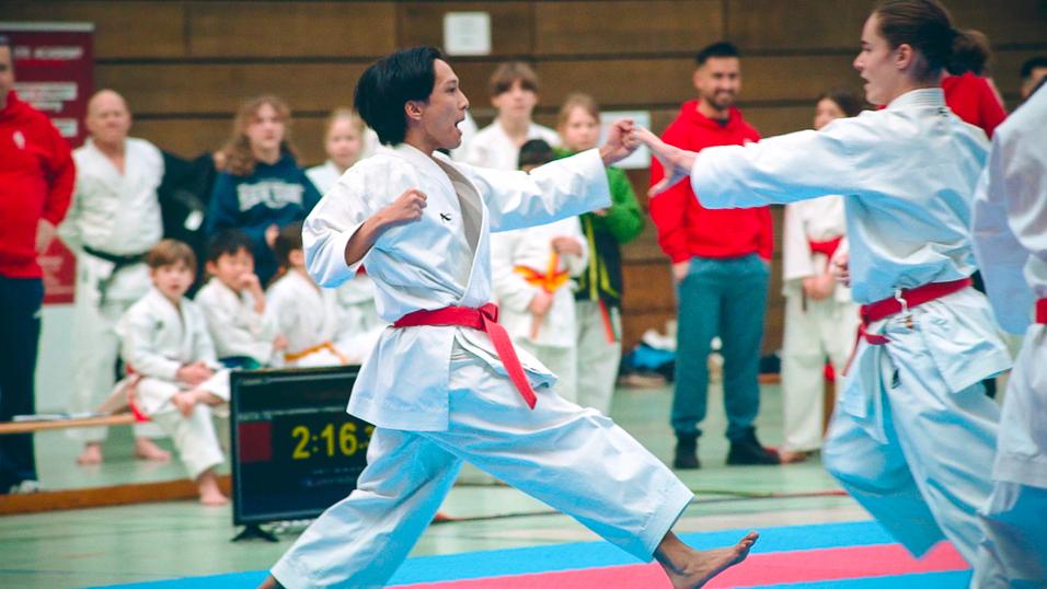 Karate Anfänger:innen und Wiedereinsteiger:innen ab 14 Jahren sind herzlich zum kostenfreien Probetraining willkommen: