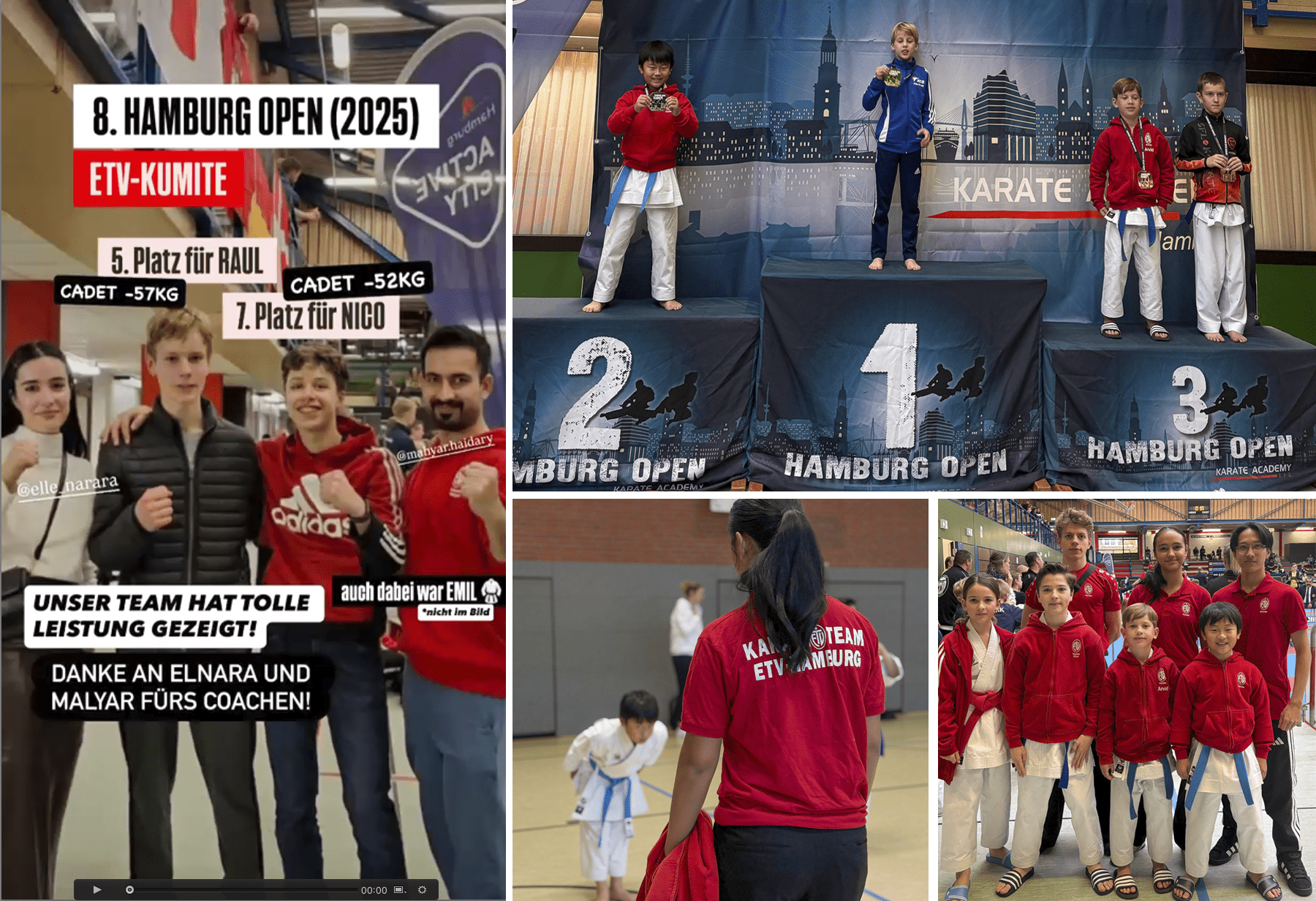 Mit über 400 Sportler:innen aus ganz Deutschland und dem benachbarten Ausland gehören die Hamburg Open zu den Qualifikationsturnieren für den Nachwuchs des Deutschen Karateverbandes. In den Altersklassen U8 bis U18 belegten die Starter des ETV einen 2., 3., 5. und 7. Platz. Ausgetragen wurden die Wettkämpfe in der in der Wandsbeker Sporthalle auf insgesamt sechs Tatamis. Mit dabei: Unsere neue C-Trainerin Elnara Guliieva hat uns bei der Betreuung der Kumitegruppe unterstützt. Herzlich willkommen Elnara!