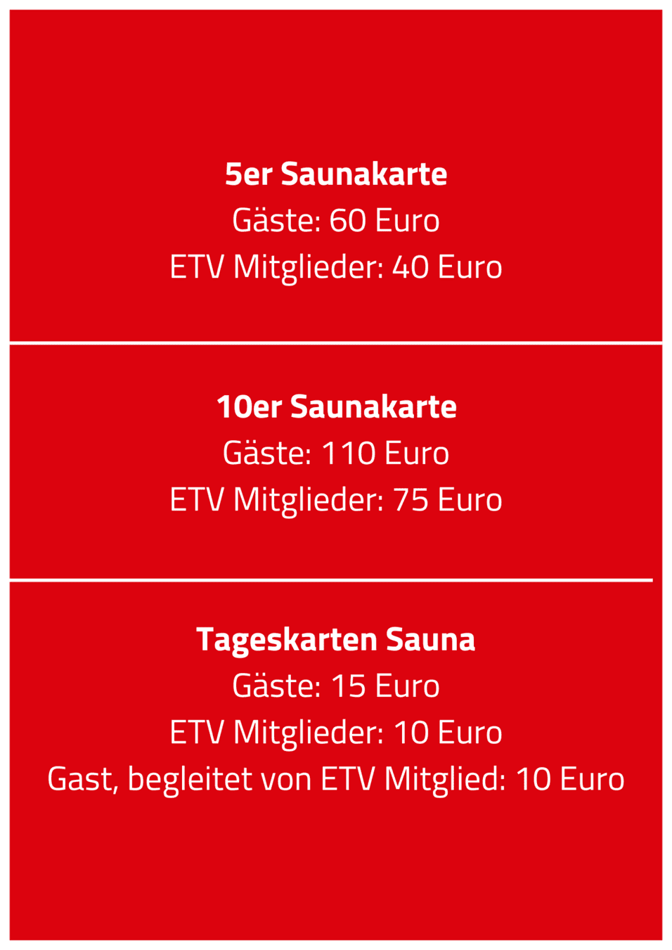 In unserer Bio-Sauna könnt ihr die Erlebnisaufgüsse selbst übernehmen; wir stellen euch dafür gerne hochwertige Düfte zur Verfügung. Nach dem Saunieren steht euch ein gemütlicher Ruheraum mit den neuesten Zeitschriften zur Verfügung. Ihr könnt die Saunen das ganze Jahr über nutzen, an sieben Tagen die Woche. Für Studiomitglieder sind diese bereits in der Mitgliedschaft enthalten, während Mitglieder aus anderen ETV-Abteilungen und Gäste Tages-, 5er- oder 10er-Karten erwerben können (am Tresen der ETV-Studios). Wenn ihr also eine Auszeit, viel Entspannung und einen gesundheitlichen Mehrwert sucht, sind unsere Saunen perfekt für euch.
