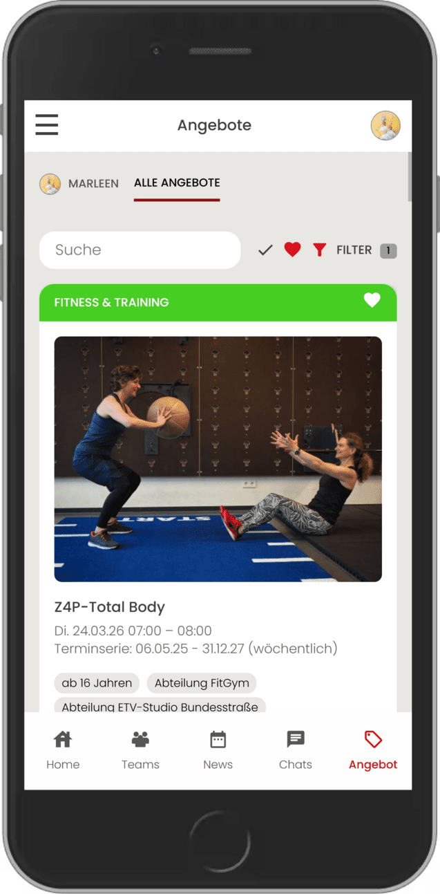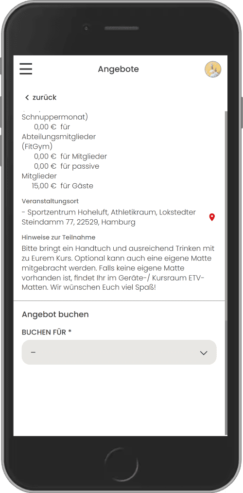 Unter dem Reiter Angebote findest du alle Kurse des ETV, in die du dich und deine Familienmitglieder eintragen kannst. Für die meisten Kurse ist eine Buchung 48 Stunden vor Kursbeginn möglich.