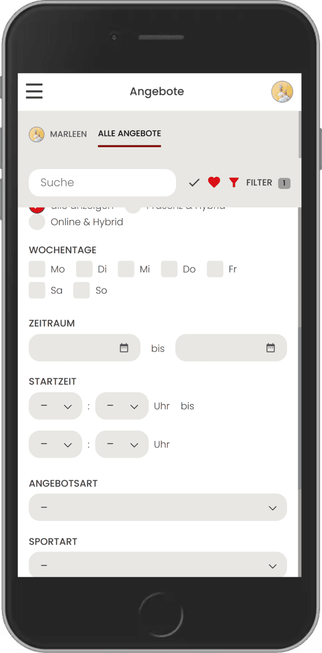 Unter Filter kannst du z. B. nach dem Wochentag, dem Ort, der Sport- oder Angebotsart filtern, um die Auswahl der Angebote einzugrenzen. Die gesetzten Filter kannst du jederzeit wieder zurücksetzen.