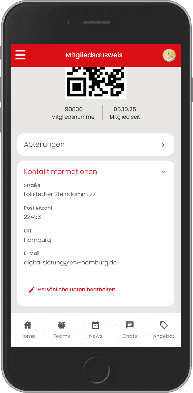 Im Mitgliedsprofil kannst du deine Kontaktdaten ganz einfach bearbeiten, falls du z.B. umgezogen bist oder eine neue Telefonnummer hast. Ebenfalls findest du deinen digitalen Mitgliedsausweis und deine Abteilungen.