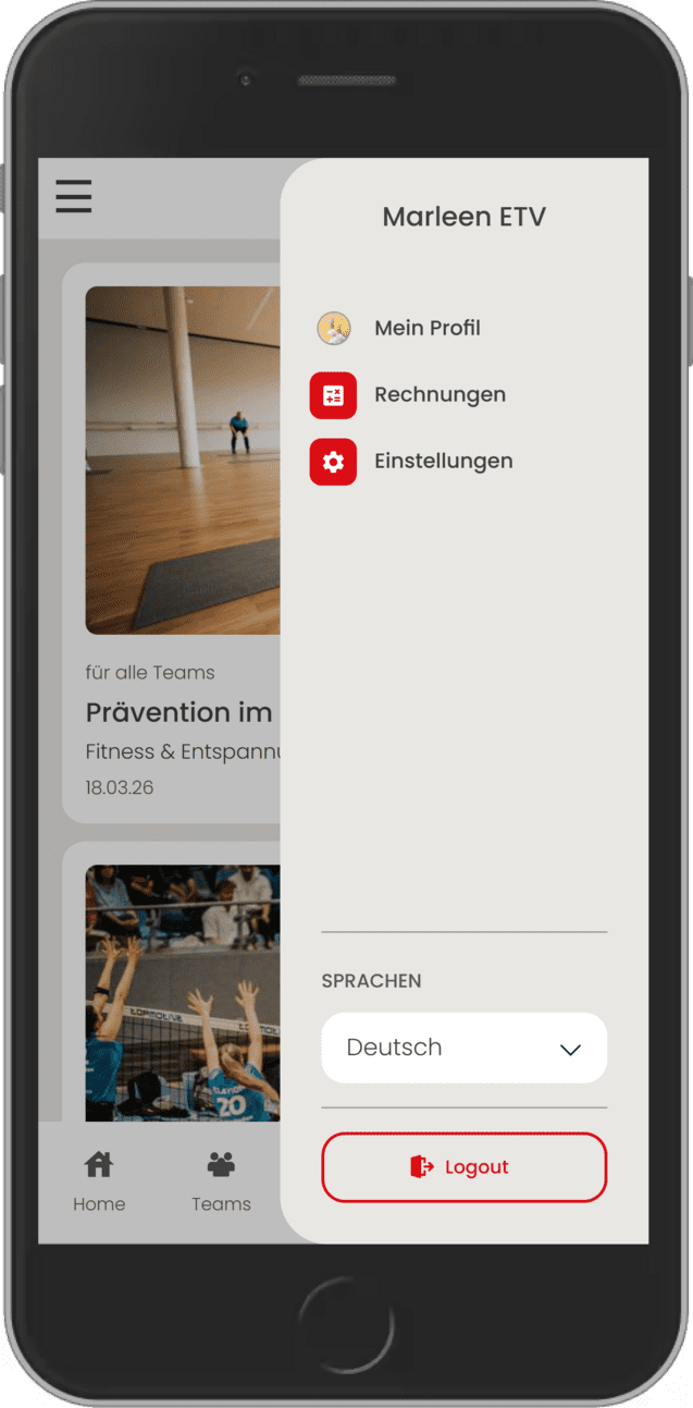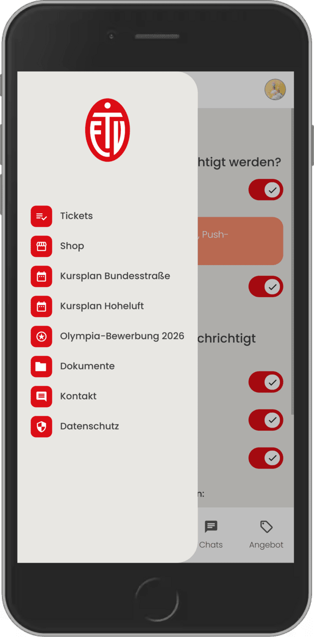 Wenn du oben links auf die 3 Striche klickst, kommst du u.a. zum Ticketshop unserer Top Teams oder zum ETV-Shop, damit du dich mit unserem Merch eindecken kannst. Außerdem findest du hier die Kurspläne für das Sportzentrum Hoheluft und Sportzentrum Bundesstraße.
