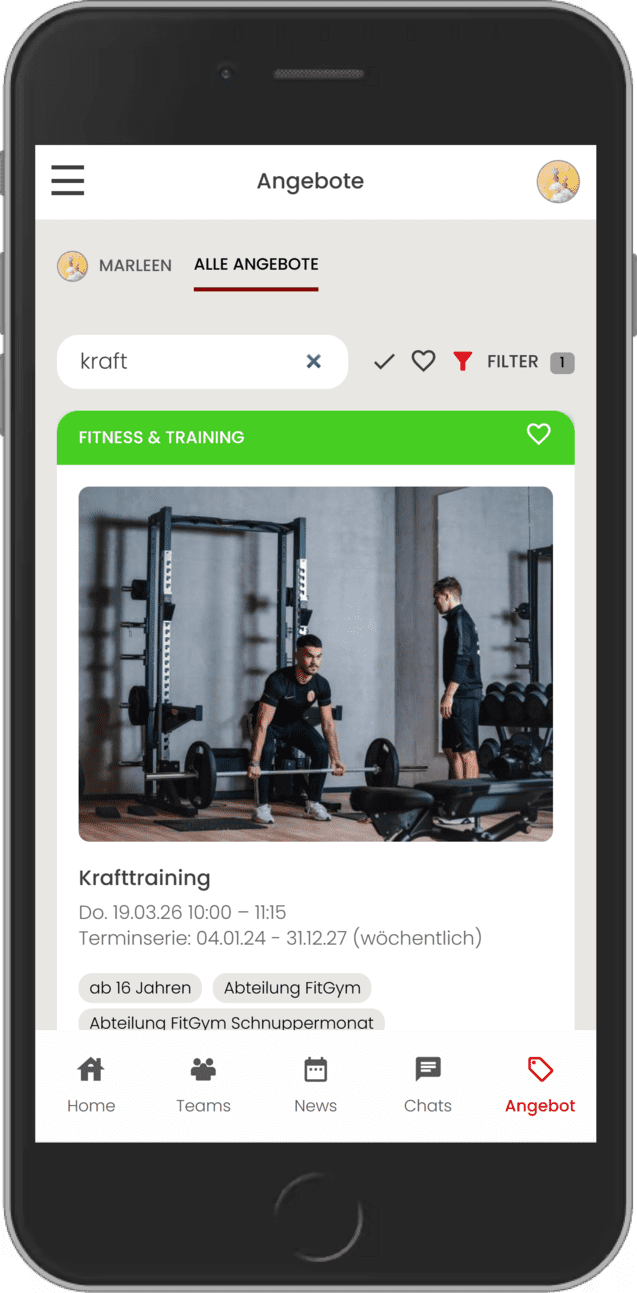 Im Reiter "Angebot" findest du die Angebotsvielfalt der verschiedenen Abteilungen des ETV. Hierbei kannst du alle Vereinsangebote sehen oder auch nur die Angebote, welche für dich und deine Familienmitglieder aktuell buchbar sind. Du kannst oben im Suchfeld nach beliebigen Kursen suchen, so findest du sie ganz einfach und schnell. Optional kannst du die Suchergebnisse über die Filter eingrenzen.