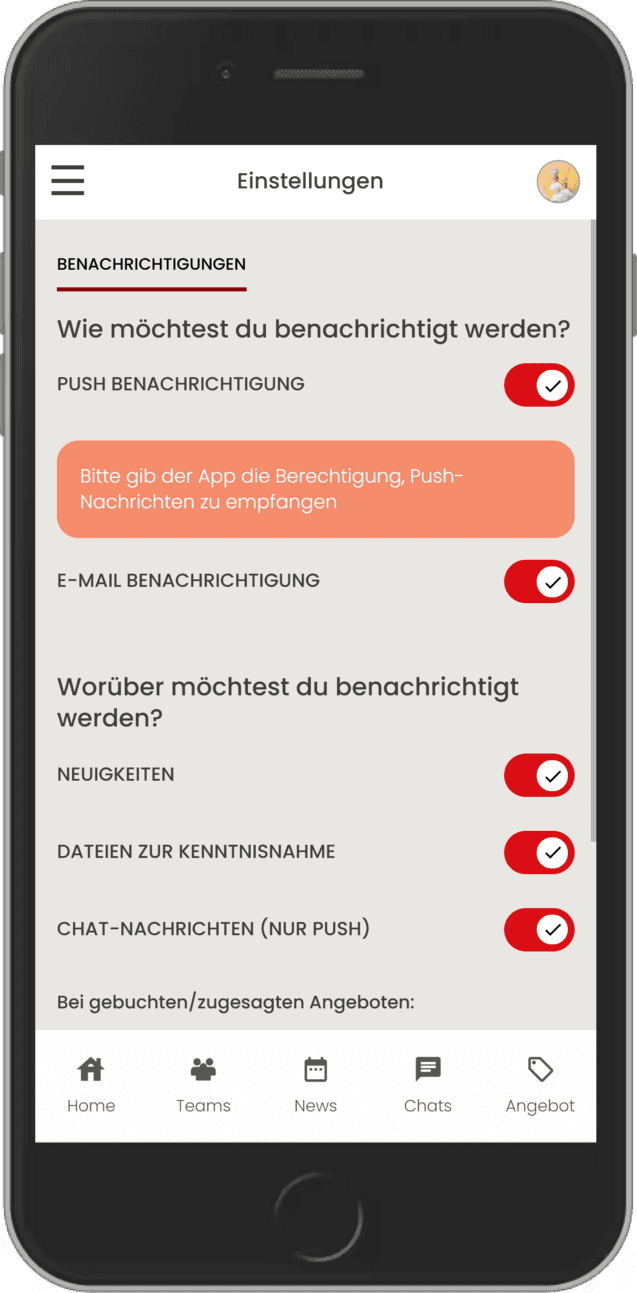 In den Einstellungen kannst du darüber entscheiden, ob die App dir Benachrichtigungen schicken darf und wenn ja, welche. Das ist besonders wichtig, falls wir dich über eine kurzfristige Änderung bei einem gebuchten Kurs oder eine spannende News informieren wollen.