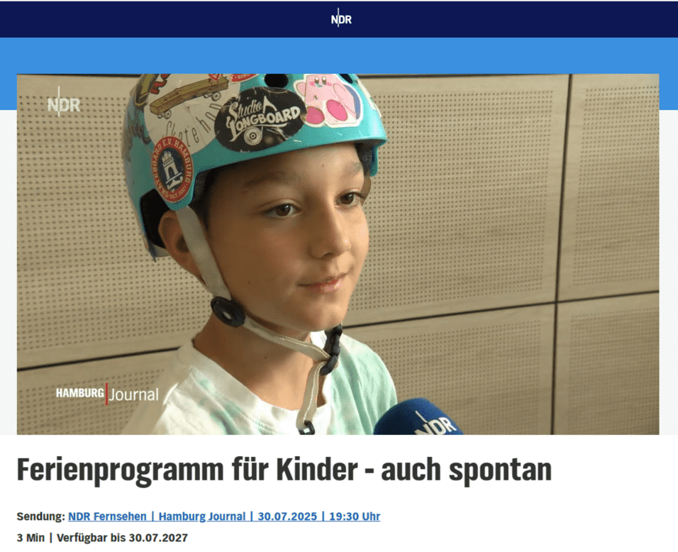Das NDR Fernsehen hat für das Hamburg Journal unser Skateboard-Camp in der Sporthalle hohe Weide besucht. Schaut euch hier den ganzen Beitrag an.
