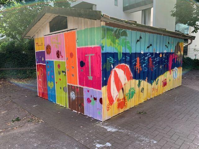 In der Ferienbetreuung wurden Schablonen hergestellt und die Sprayarbeiten vorgenommen. Jetzt ist das farbenfrohe und kreative Spielhaus fertig und wir freuen uns über das tolle Ergebnis.